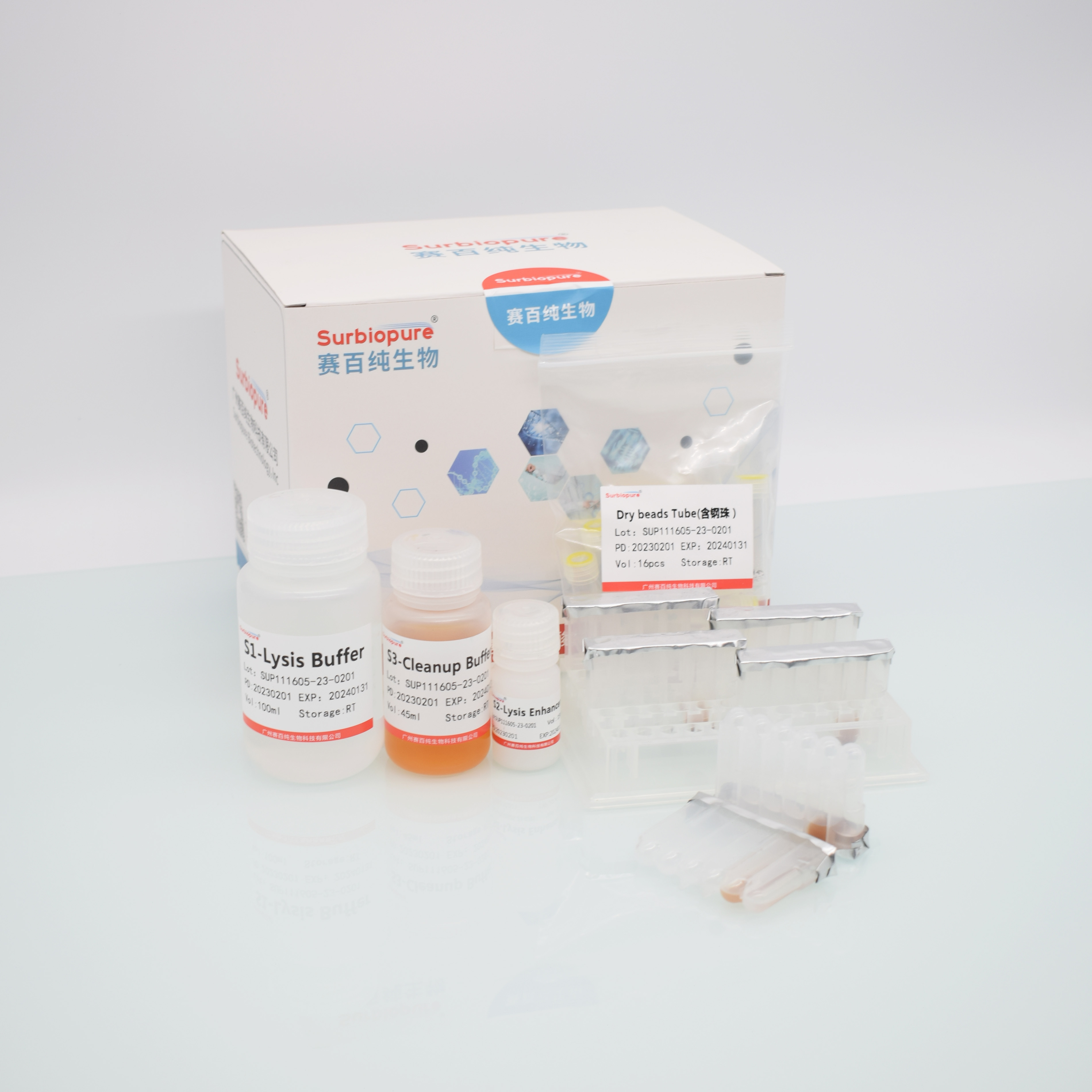 【產品名稱】糞便核酸提取試劑盒 英文名稱:nucleic acid extraction kit for faeces 【包裝規(guī)格】40份/盒、60份/盒、64份/盒、96份/盒 【預期用途】 本試劑盒是專門從糞便、肛拭子等樣品中病毒、細菌DNA的提取和純化而設計的。試劑盒采用磁珠法純化技術,并結合獨創(chuàng)的腐殖酸吸附劑技術,適合于從各種環(huán)境拭子、土壤、糞便、尿液病毒和細菌微生物宏基因組的篩查及NGS檢測。目前廣泛應用的例子:土壤,糞便,尿液,肛拭子;試劑盒能夠從此類樣品中提取高產量高純度的總DNA 。 【實驗原理】 試劑盒是采用高結合力的納米磁珠為基質。磁珠在高濃度離子化劑(如鹽酸胍或異硫氰酸胍)條件下,可通過氫鍵和靜電等物理因素吸附核酸而形成磁珠核酸復合物,而蛋白質或其它雜質不被吸附而去除。吸附了核酸的磁珠經洗滌去除蛋白質和鹽,最后可以用低鹽緩沖液(如Buffer TE)或水,洗脫出納米磁珠上吸附的核酸。得到的核酸純度高,可直接用于各種下游實驗。此外,S3-抑制物清除劑溶液是我們獨創(chuàng)的腐殖酸吸附劑,該吸附劑可選擇性吸附DNA樣品中的腐殖酸等抑制因子,提高DNA純度。111601